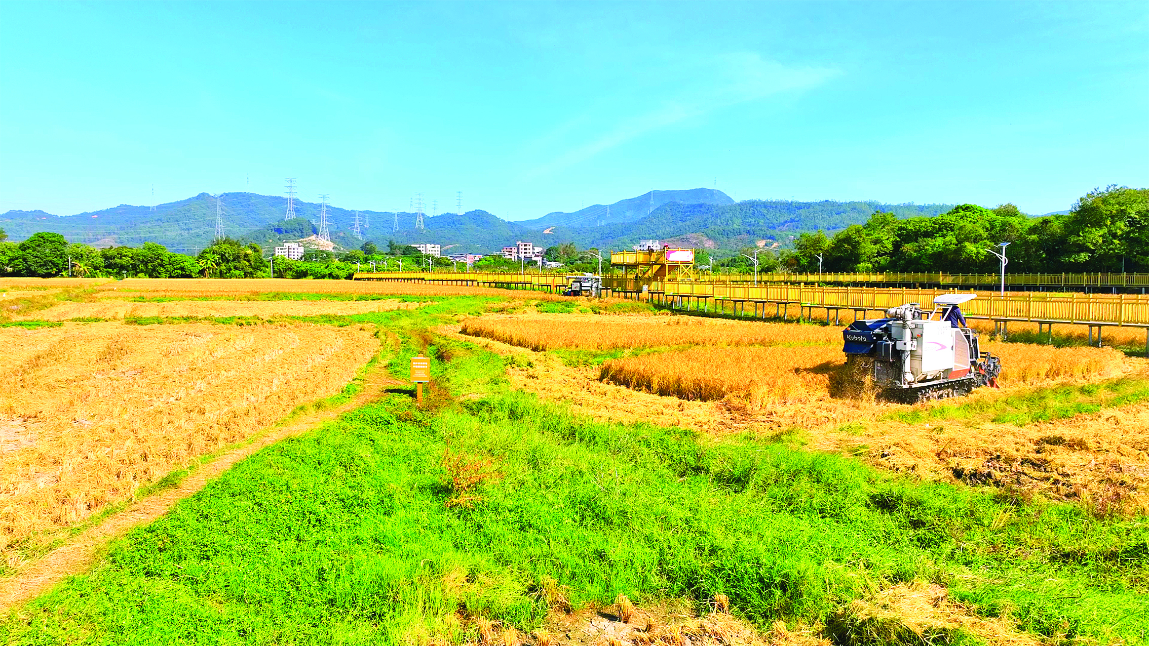 风禾尽起,盈车嘉穗。冬日的阳光铺洒在大亚湾上角村的“美丽田园”。微风中,金黄的稻田泛起层层波浪。伴随着收割机的轰鸣声,一排排水稻被整齐地收割卷入,切碎的秸秆从机尾均匀排出,一粒粒金黄的稻谷被收拢入仓。据悉,这片百亩稻田共收割稻谷3万多斤。