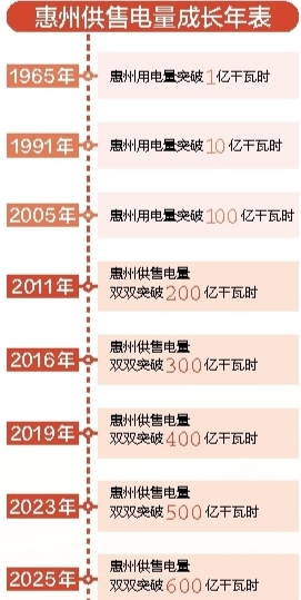 时间轴拉长来看,自2005年惠州用电量首次突破100亿千瓦时以来,20年时间里,惠州供售电量先后迈上多个百亿台阶,并且用时越来越短:从100亿千瓦时迈向200亿千瓦时,用了6年时间;而从500亿千瓦时迈向600亿千瓦时,仅用了2年时间。不断缩短的跨越周期,精准反映出惠州特别是“十四五”以来经济社会日新月异的发展。电力增长的曲线,成为观察惠州这座城市经济活力、产业转型与未来潜力的关键刻度。