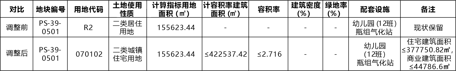 1.根据《国土空间调查、规划、用途管制用地用海分类指南》将PS-39-0501地块规划用地性质由二类居住用地(R2)修正为二类城镇住宅用地(070102)。