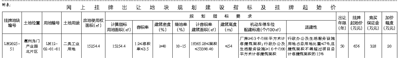 根据《招标拍卖挂牌出让国有建设用地使用权规定》(国土资源部令第39号)和《广东省土地使用权交易市场管理规定》(广东省人民政府令第304号)的规定,经批准,我局决定以网上挂牌方式公开出让1宗国有建设用地使用权。[公告具体内容请登陆惠州市公共资源交易中心土地与矿业网上挂牌交易系统(https://tdky.hzggzyjy.cn/)]