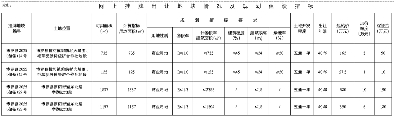 根据《招标拍卖挂牌出让国有建设用地使用权规定》(国土资源部令第39号)和《广东省国有建设用地使用权交易市场管理规定》(广东省人民政府令第304号)的规定,经批准,我局决定以网上挂牌方式公开出让下列四宗国有建设用地使用权。[公告具体内容请登录惠州市公共资源交易中心土地与矿业挂牌电子交易系统(https://tdky.hzggzyjy.cn/)]。