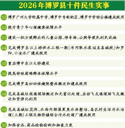 1月30日下午,博罗县十七届人大六次会议第二次全体会议票决产生了2026年博罗县十件民生实事。这些实事涵盖便民设施建设、教育医疗提质、交通出行优化、污水治理升级、特殊困难群体保障等多个领域。