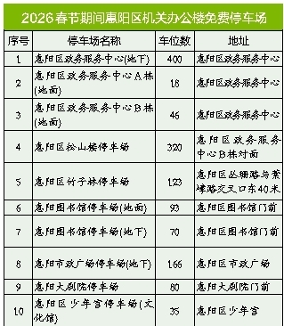 惠州日报讯 (记者李芳娟)春节将至,惠阳送上暖心便民举措。为方便市民节日出行停车,惠阳区委、区政府聚焦群众实际需求,以务实行动提升公共服务体验,将在2026年春节假期免费开放10处机关办公楼停车场,为社会公众提供1351个公共停车位。此次停车场免费开放时段:2026年2月15日零时~2月23日24时,全力保障节日停车需求。