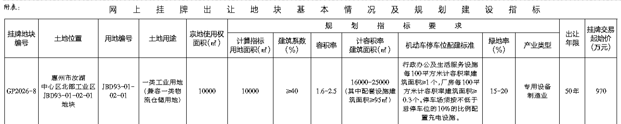 根据《招标拍卖挂牌出让国有建设用地使用权规定》(国土资源部令第39号)和《广东省国有建设用地使用权交易市场管理规定》(广东省人民政府令第304号)的规定,经批准,我局决定以网上挂牌方式公开出让下列一宗国有建设用地使用权。公告具体内容请登录惠州市公共资源交易中心土地与矿业挂牌电子交易系统(https://tdky.hzggzyjy.cn/):