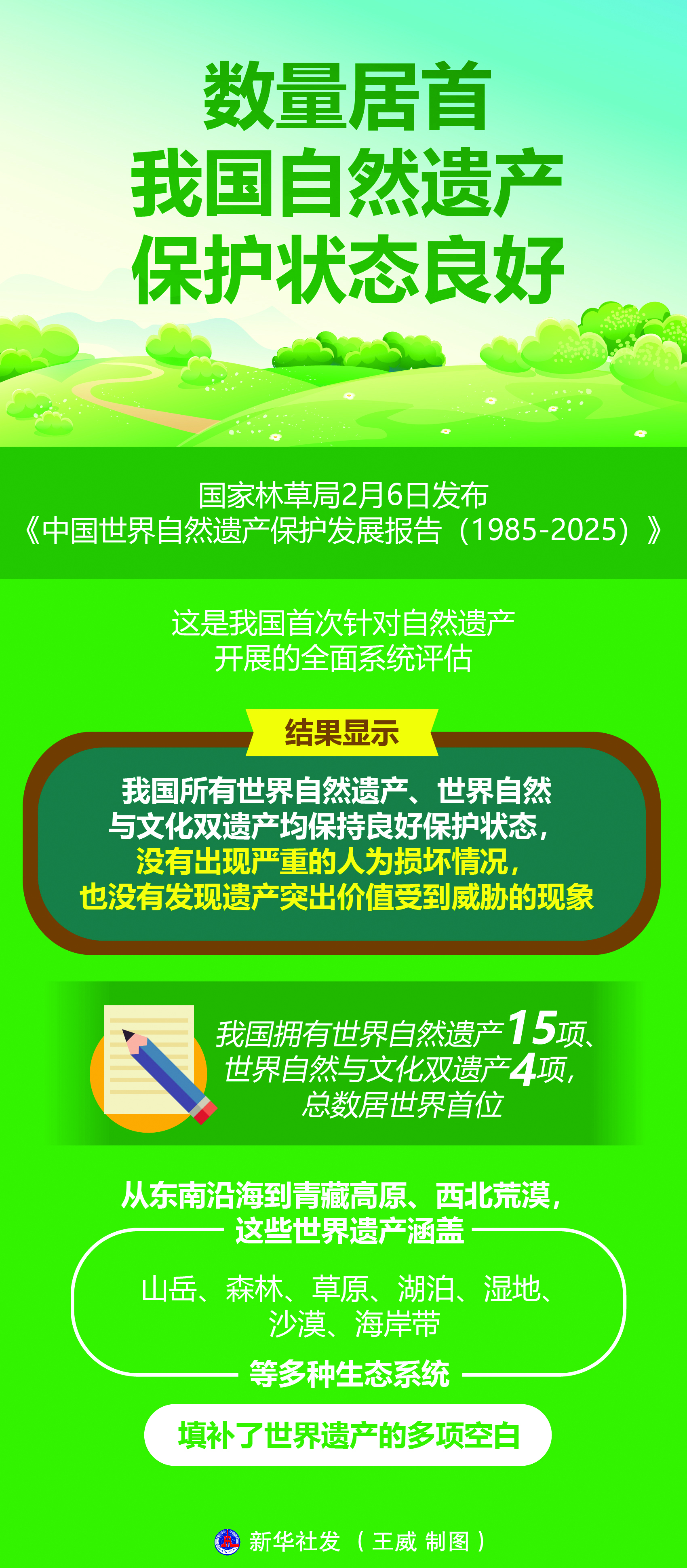 国家林草局近日发布《中国世界自然遗产保护发展报告(1985-2025)》,这是我国首次针对自然遗产开展的全面系统评估。结果显示,我国所有世界自然遗产、世界自然与文化双遗产均保持良好保护状态,没有出现严重的人为损坏情况,也没有发现遗产突出价值受到威胁的现象。
