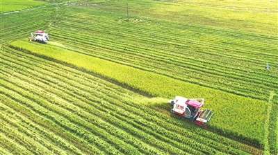 8月24日,在湖南省邵阳市隆回县司门前镇石山湾村,农民驾驶收割机抢收中稻(无人机照片)。 处暑时节,各地农民抢抓农时劳作,田间地头一派忙碌景象。 新华社发