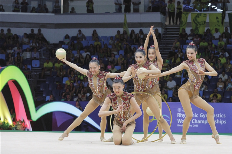 ■24日,为期5天的第41届国际体联艺术体操世锦赛在巴西里约热内卢落幕,中国队在收官日获得集体5带单项金牌和3球2圈铜牌。