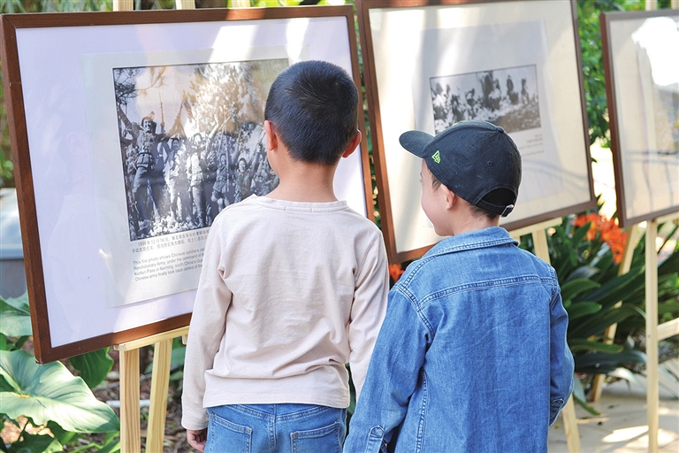 “孩子们,今天我们齐聚于此,观看纪念中国人民抗日战争暨世界反法西斯战争胜利80周年图片展。”韩芳说。