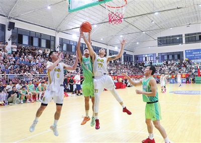 当晚,紫金县体育馆内人声鼎沸、热闹非凡。赛场上,队员们配合默契,传球、突破、投篮一气呵成,精彩瞬间引发观众阵阵喝彩,将比赛氛围不断推向高潮。经过激烈比拼(上图,肖斌摄),龙窝镇茶叶肉丸队战胜对手,获得总决赛冠军。