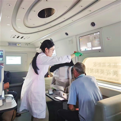 ■医生在专业眼科巡诊车上为群众提供“登记—检查—诊断—指导”一站式服务。资料图片