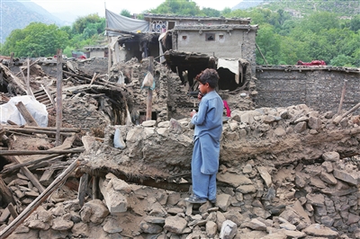 ■9月1日,在阿富汗库纳尔省努尔加尔的马扎里峡谷,一名男孩站在震后的废墟上。