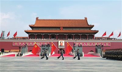 全体肃立,80响礼炮震彻云霄,国旗护卫队官兵护卫着五星红旗,迈着矫健的步伐,从人民英雄纪念碑行进至广场北侧升旗区。中国人民解放军联合军乐团奏响雄壮的《义勇军进行曲》,全场齐声高唱中华人民共和国国歌,鲜艳夺目的五星红旗冉冉升起,在天安门广场上空高高飘扬。