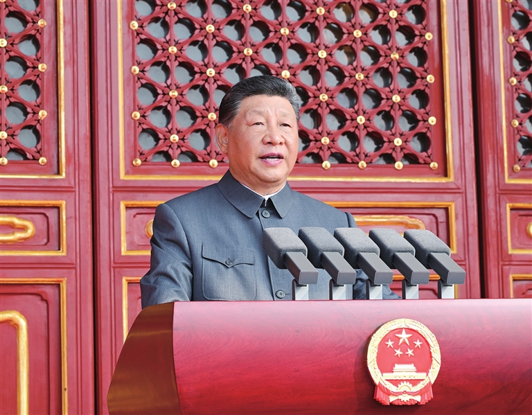 习近平强调,中华民族是不畏强暴、自立自强的伟大民族。当年,面对正义与邪恶、光明与黑暗、进步与反动的生死较量,中国人民同仇敌忾、奋起反抗,为国家生存而战,为民族复兴而战,为人类正义而战。今天,人类又面临和平还是战争、对话还是对抗、共赢还是零和的抉择。中国人民坚定站在历史正确一边、站在人类文明进步一边,坚持走和平发展道路,与各国人民携手构建人类命运共同体。