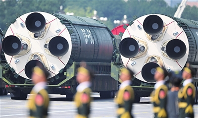 最引人瞩目的是战略打击群,“东风-5C”液体洲际战略核导弹和“东风-61”陆基洲际导弹等大国重器威震寰宇,首次集中展示我军海、陆、空基“三位一体”战略核力量。这些国产新型装备既有慑战止战的战略重器,也有克敌制胜的战术利器,标志着人民军队武器装备建设取得历史性突破。