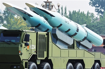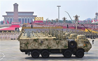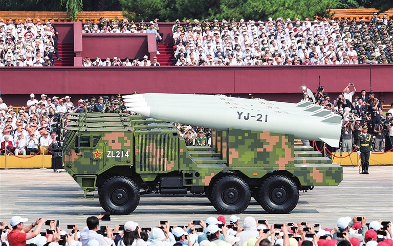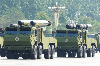 ■高超声速导弹方队受阅的鹰击-21飞行速度快,突防能力强,命中精度高,是具备全天候作战能力的新型杀手锏。