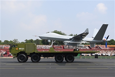 ■空中无人作战方队受阅的装备,是我国自主研制的新型空中无人装备,具有陆基、舰基作战能力,主要执行战场侦察、监视、打击等多样化作战任务。方队以海军某团和空军航空兵某团为主体抽组建成。