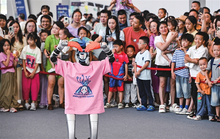 人形机器人在智博会上与观众互动。