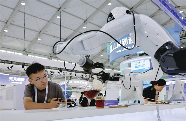 9月10日,参观者观看机器人演示饮品服务。 9月10日至9月13日,2025Inclusion·外滩大会在上海黄浦世博园区举行。本届外滩大会除开幕主论坛、开放见解论坛和AI科创系列赛事等活动外,还有近200家科技企业携超30项科技新品在科技主题展亮相,与会者还能在大会设置的机器人小镇和科技集市上,领略人工智能领域的前沿科技。 新华社发
