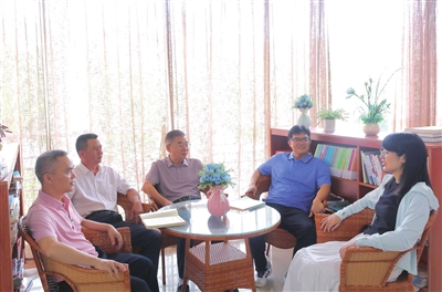 ■在9月10日教师节座谈会上,龙川县第一中学教师(左起)叶景青、唐孟强、钟永忠、刘国华、邓健美“五代”同框。
