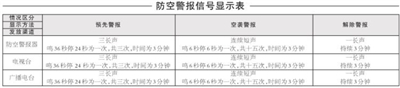 为贯彻落实《中华人民共和国人民防空法》,检验我市人民防空警报设施性能是否良好,进一步增强市民的国防观念和人防意识,经市政府同意,定于9月18日10时30分至11时00分在市区及各县县城进行防空警报试鸣。届时,防空警报器、河源电视台、广播电台及各县电视台、广播电台将同时分别通过声音、图像向广大群众发出“预先警报”、“空袭警报”和“解除警报”三种防空警报信号,各种信号鸣放1次(见下表)。望广大群众听(看)到防空警报信号时,不要惊慌,注意听辨,照常工作和活动。