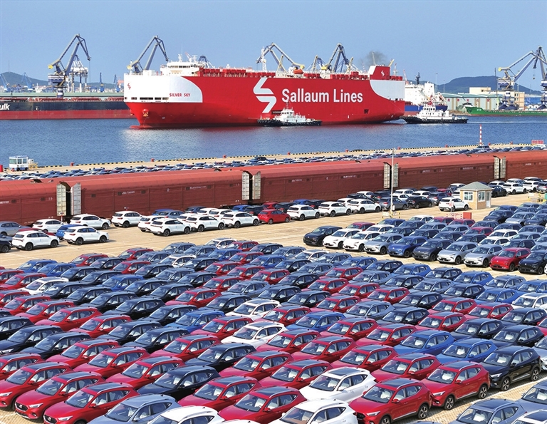 ■国产汽车在山东港口烟台港集结等待装船出口。
