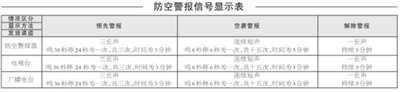 为贯彻落实《中华人民共和国人民防空法》,检验我市人民防空警报设施性能是否良好,进一步增强市民的国防观念和人防意识,经市政府同意,定于9月18日10时30分至11时00分在市区及各县县城进行防空警报试鸣。届时,防空警报器、河源电视台、广播电台及各县电视台、广播电台将同时分别通过声音、图像向广大群众发出“预先警报”、“空袭警报”和“解除警报”三种防空警报信号,各种信号鸣放1次(见下表)。望广大群众听(看)到防空警报信号时,不要惊慌,注意听辨,照常工作和活动。