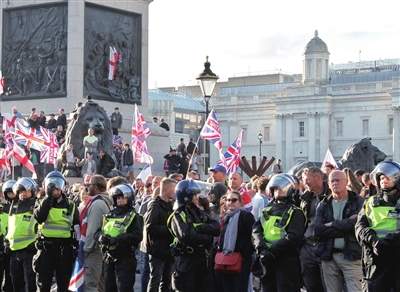 抗议现场部署了大批执勤警察,负责分隔持对立立场的抗议人群。记者看到,有抗议者向警察投掷啤酒瓶。伦敦警方事后通报说,部分警员在分隔人群时遭到袭击,数十人受伤,其中4人伤势严重,另有24名抗议者被逮捕。