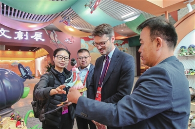 9月21日,与会嘉宾在第八届丝绸之路(敦煌)国际文化博览会上参观应用3D打印技术打印的文创产品。