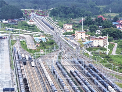 ■9月21日,中老铁路上的货运列车在磨憨站通过(无人机照片)。
