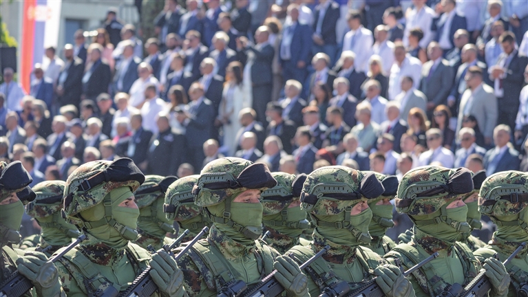 ■9月20日,在塞尔维亚首都贝尔格莱德,军人经过观礼台接受检阅。