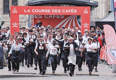 当日,法国首都巴黎举行具有百年历史的服务员赛跑活动。数百名穿着制服的男女服务员手托餐盘,餐盘内放着羊角面包、一个空咖啡杯和一杯水,从巴黎市政厅出发,沿环线跑完4公里的赛程。巴黎服务员赛跑最早始于1914年。今年还增加了普通民众赛跑环节。