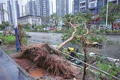 ■9月24日在广东阳江市江城区横一路拍摄的被风吹倒的大树和电动自行车。