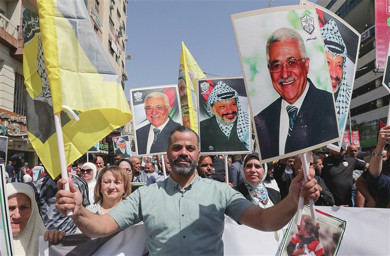 ■9月23日,在约旦河西岸城市纳布卢斯,民众挥舞巴勒斯坦领导人阿拉法特和阿巴斯画像参加庆祝活动。