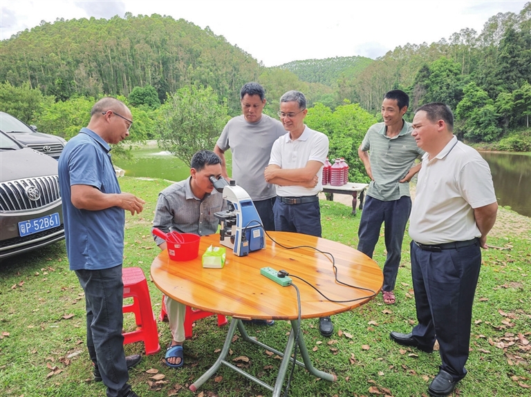 在东源县义合镇远阳农场,烈日下的鱼塘边,几名政协委员正与养殖户蹲在一起查看鱼体。戴远棠手持水质检测仪器,边操作边解释:“你这个水氨氮偏高,要注意增氧和换水频率。”养殖户忙着记录,生怕错过任何细节。