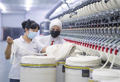 记者走进产业园看到,生产车间敞亮整洁,不少纺织器械都是中国制造。当地工人正专心致志地进行印染、缝纫等工作,其中女员工占据相当比例。