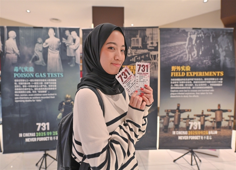 ■9月24日,在马来西亚吉隆坡,观众在电影《731》展板前拍照留念。