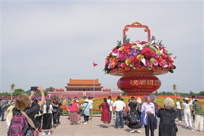 ■游客在天安门广场观赏“祝福祖国”大花篮(9月25日摄)。
