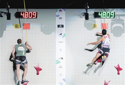 ■9月25日晚,中国选手龙见国(右)在金牌赛中。最终,他获得冠军。 当日,2025年攀岩世锦赛男子速度赛决赛在韩国首尔举行。中国选手龙见国以4.809秒的成绩,战胜德国选手夺冠。这是中国队时隔13年再度斩获该项目世锦赛金牌,也是攀岩项目进入奥运会后,中国运动员夺得的首枚世锦赛金牌。新华社发