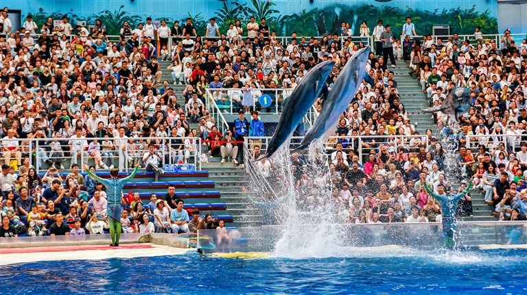 ■10月4日,在天津市滨海新区极地海洋度假区,市民和游客观看表演。 国庆中秋假期,人们选择多种方式出游赏景、放松休闲。 新华社发