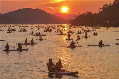 国庆中秋假期,万绿湖周边桨板运动人气高涨,现场热闹非凡。据东源县新港镇龙镇村逐波桨板负责人介绍,假期每日涌入新港镇龙镇村的人流量是平日三倍之多。
