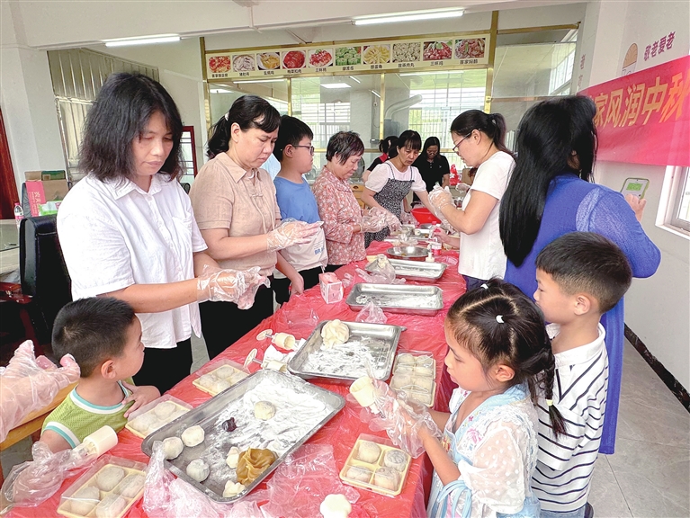 ■10月6日,巾帼志愿者给小朋友们示范揉面、包馅、压模、定型等流程,跟亲子家庭分享月饼制作技巧。 连日来,江东新区妇联组织巾帼志愿者先后在临江镇胜利村、城东街道、古竹镇雅色村党群服务中心开展“三美家风润中秋阖家共品团圆味”主题活动。志愿者在现场介绍了中秋赏月、祭月等传统习俗的起源与内涵,结合月饼的历史演变科普制作原料、配方及健康饮食知识,引导孩子们理解中秋文化的深厚底蕴。 本报记者肖斌朱晓颖摄