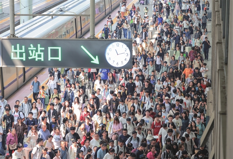 ■10月7日,旅客在南京火车站有序出站。国庆中秋假期进入尾声,各地返程客流攀升。新华社发