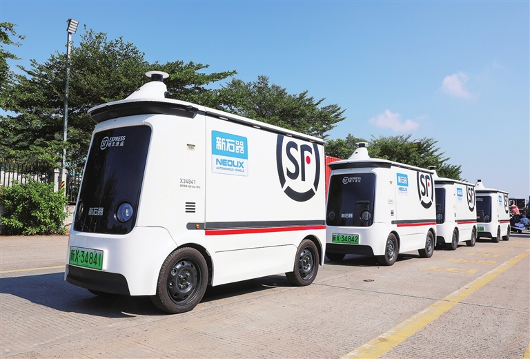 10月17日上午10时许,顺丰速运河源南城转运中心,工作人员在手机上下达相关指令后,装载包裹的无人快递车从转运中心出发,按照预设线路,为附近客户提供着高效、便捷的快递配送服务。“我们转运中心近期配备了5辆无人快递车进行运行测试,每天每班次平均给河源国家高新区和江东新区临江镇的营业网点运送300票(件)左右的快递,一般十来分钟就能到达网点。”该中心相关负责人张品品说,以前这两个网点每天只能送一趟,现在每天可以不间断揽投件,实现了降本增效。