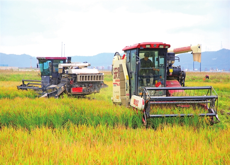 ■10月19日,农机手驾驶农机在浙江省玉环市漩门湾三期智慧农业示范基地内收割海水稻。