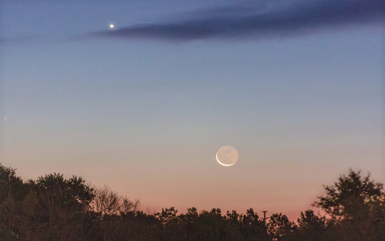 ■10月19日、20日黎明前,化身为启明星的金星与一弯残月在东方低空近距离相伴,上演一幕浪漫的“星月童话”。新华社发
