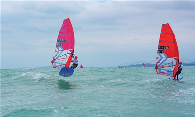 ■10月20日,广东队选手郑曼佳(左)和四川队选手陈雨在女子水翼帆板级比赛中。