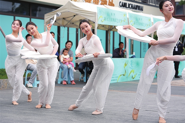 ■10月26日,浙江音乐学院舞蹈学院演员在新市古镇表演民间舞《丝丝簸影》。