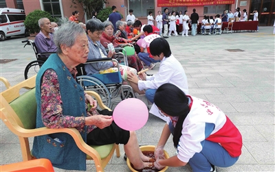 ■29日,学生们为老人进行中药泡脚护理活动。 当日是重阳节,河源市卫生学校的师生们走进东源协力养老中心,开展“红色精神领航向,孝亲志愿护安康”主题活动,用专业技能温暖长者心田。 此次活动有康复理疗、中药泡脚、血压测量等专业服务,还通过文艺表演、红色故事会等多种方式,为老人们送去了欢乐与慰藉。 本报记者冯晓铭邹茹玉摄