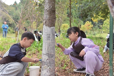 活动中,小朋友在了解树木刷白防虫、抗毒、抗寒的作用机理后,为树木涂抹涂白剂,为树干穿上“防护衣”,将劳动实践与学科知识融为一体。