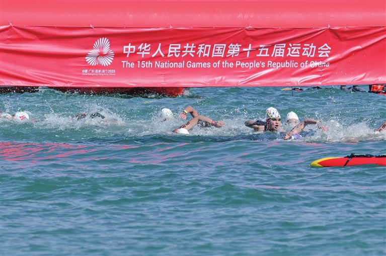 ■11月5日,参赛选手在比赛中。 当日,在广东省深圳市举行的第十五届全运会女子10公里马拉松游泳决赛中,浙江队选手柳雅欣以2小时11分42秒9的成绩夺得冠军,广西队选手尹芳芳和福建队选手吴静萱分别获得亚军和季军。新华社发